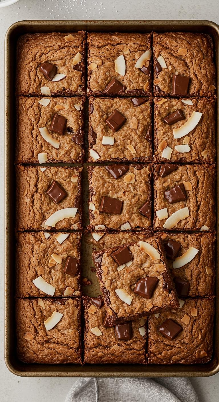 - Mix in flour, chocolate chips, coconut, almonds, and vanilla. Spread the mixture in a greased baking pan.