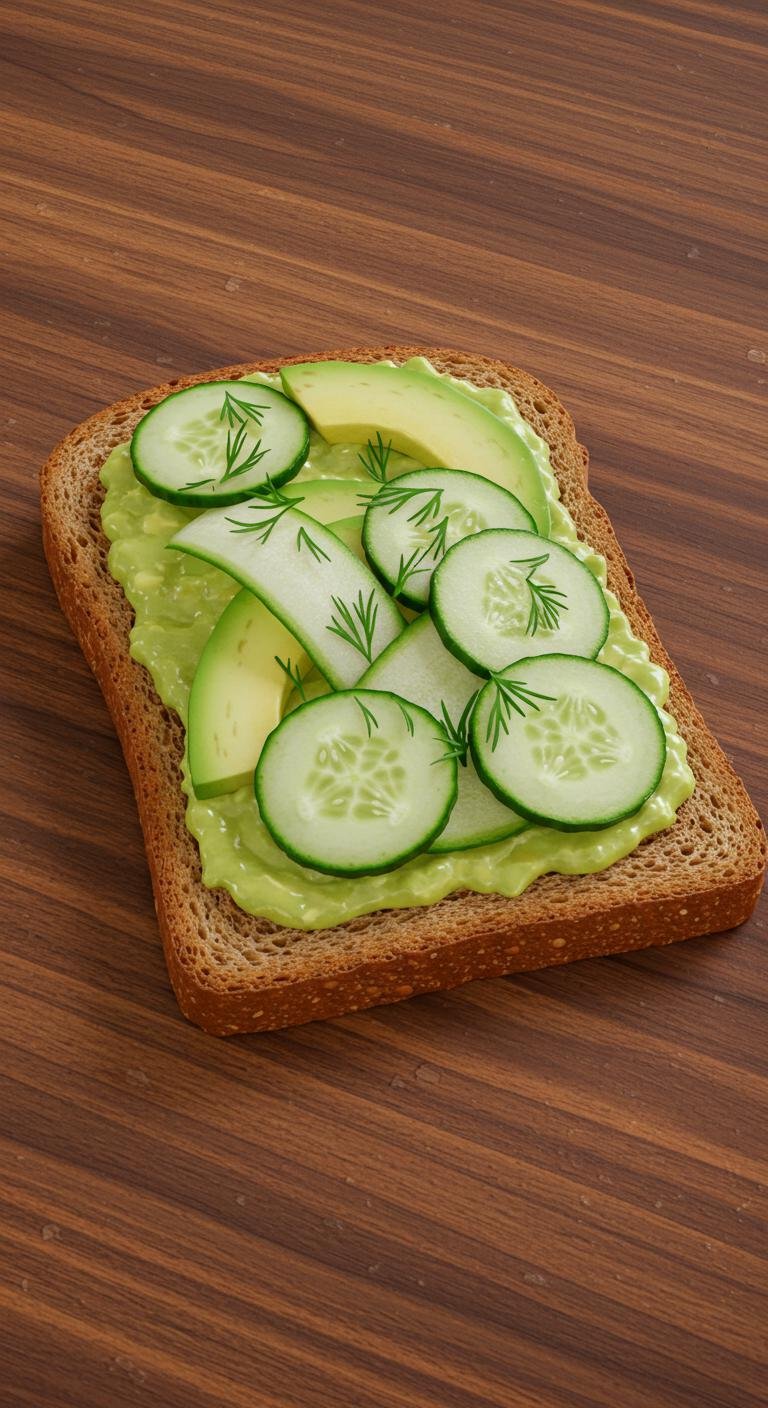 - Spread the avocado on the toast and layer with cucumber slices and dill.