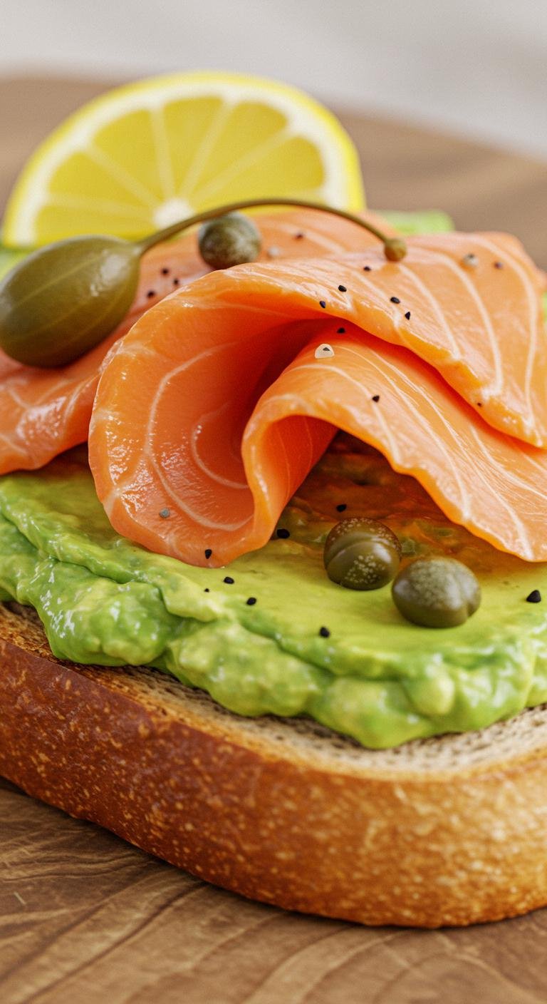 - Spread the mashed avocado and layer with smoked salmon and capers.