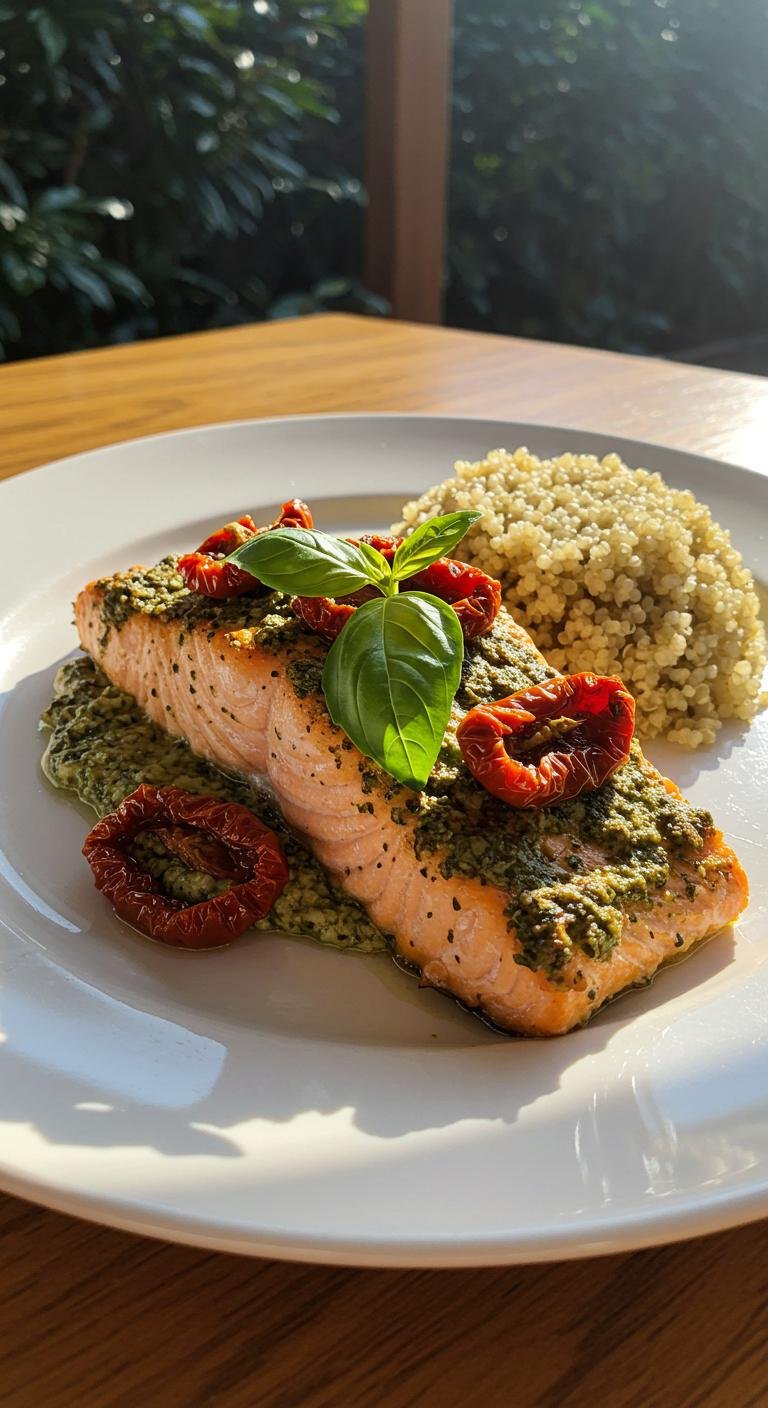- Spread pesto on the salmon and top with sun-dried tomatoes.