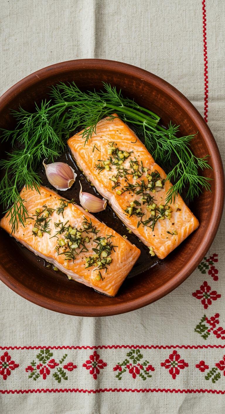 - Combine garlic, dill, salt, and pepper, then rub onto salmon. Top with lemon slices.