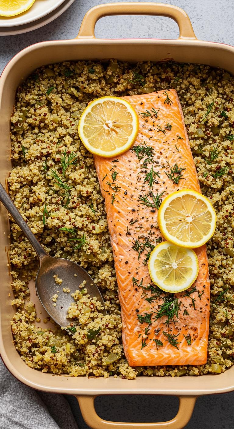 - In a baking dish, mix cooked quinoa with lemon juice, zest, dill, salt, and pepper. Lay salmon on top.