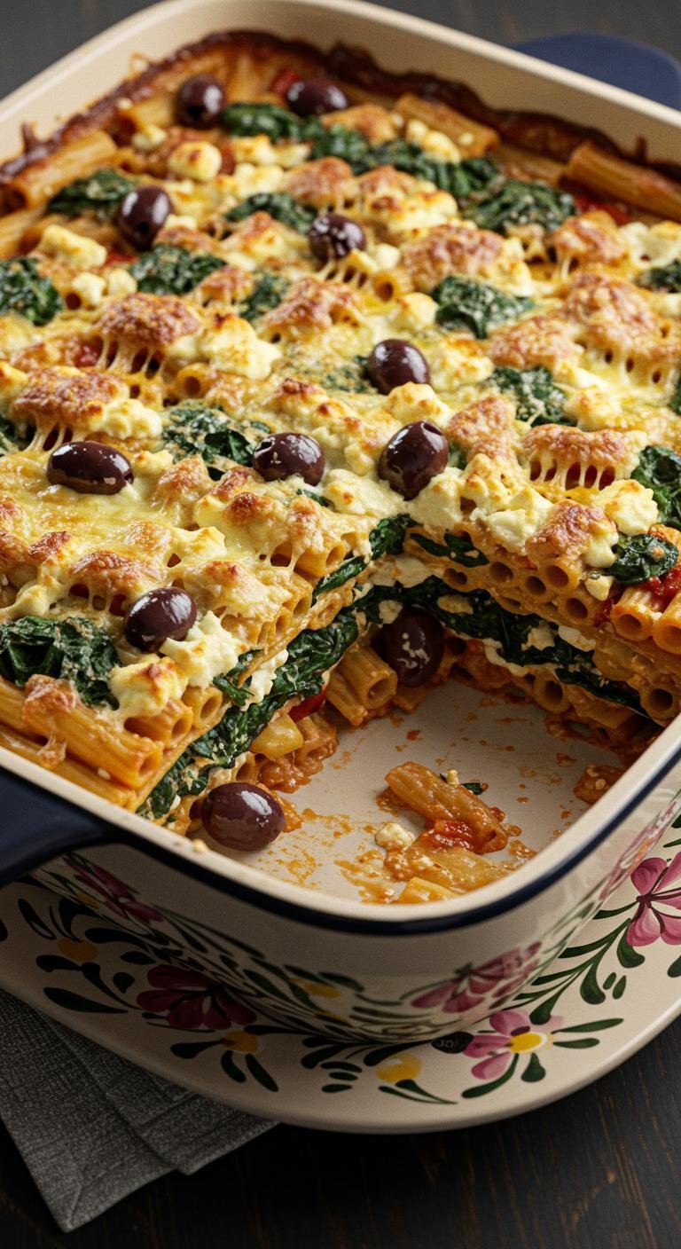 - Mix cooked ziti with marinara, spinach, feta, and olives.