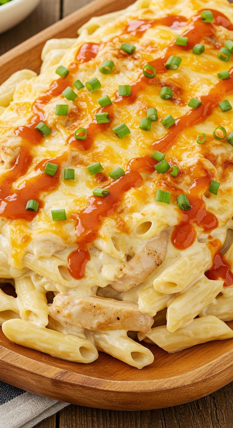 - Combine cooked pasta, chicken, Alfredo, and buffalo sauce in a large bowl. Pour into a baking dish and sprinkle mozzarella on top.