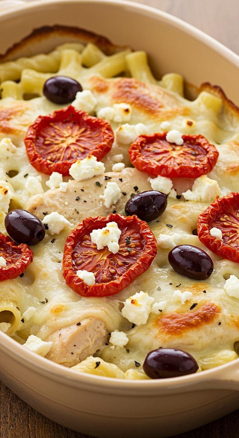- In a bowl, combine pasta, chicken, Alfredo, sun-dried tomatoes, and olives. Pour into a baking dish and top with feta.