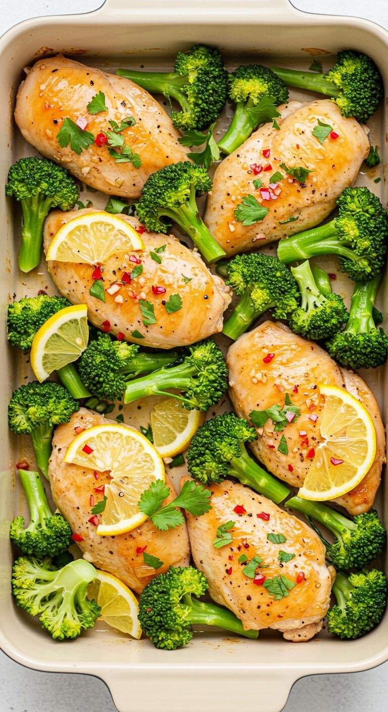 - In a baking dish, combine chicken, broccoli, lemon juice, garlic, salt, and pepper.