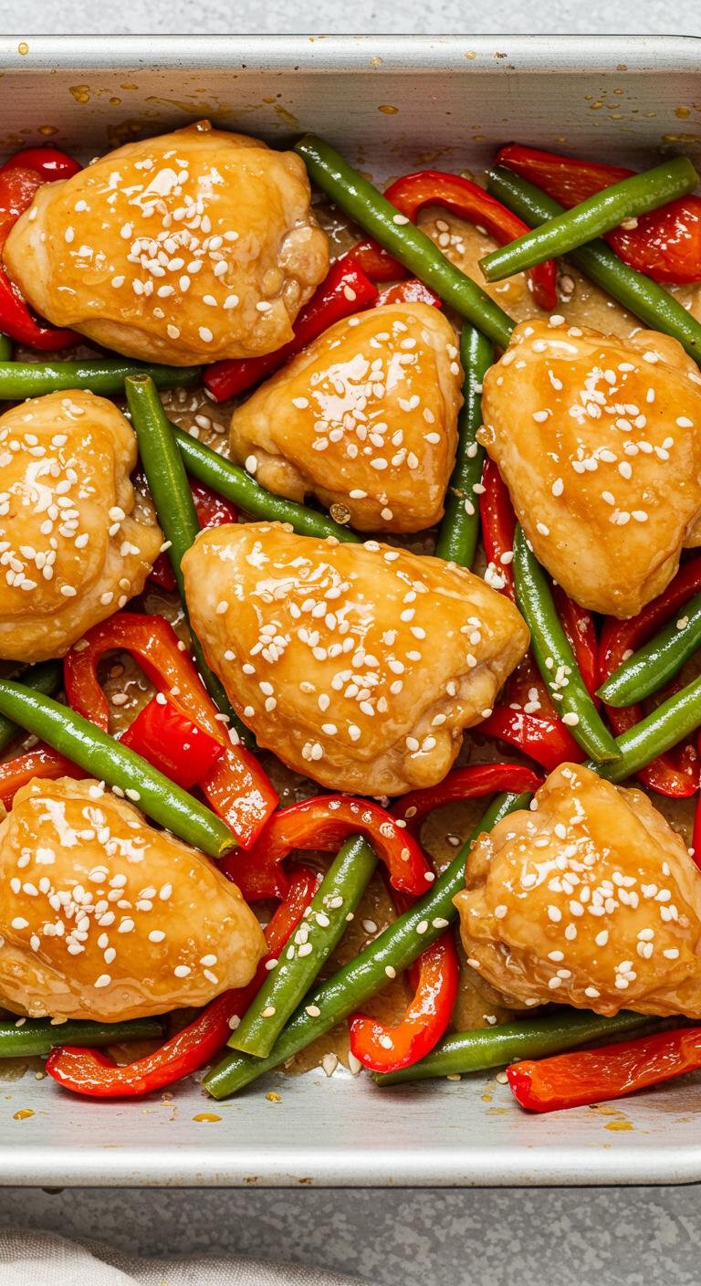 - Combine chicken, peppers, green beans, honey, and soy sauce in a baking dish.