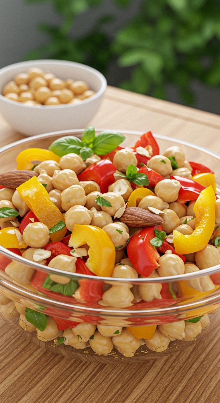 - Combine chickpeas, bell pepper, and nuts in a mixing bowl.