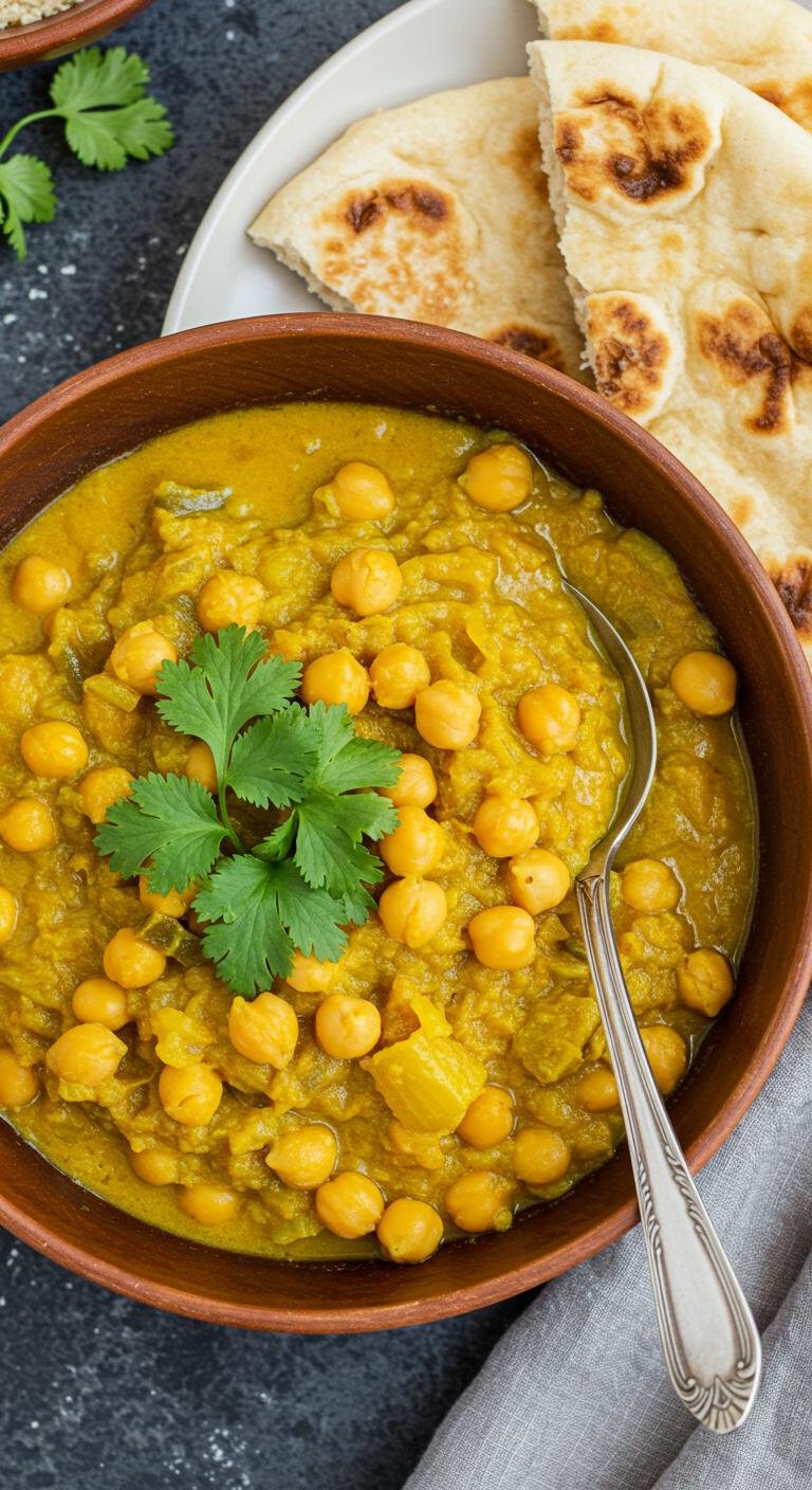 - Add chickpeas, coconut milk, and curry powder; simmer for 15 minutes.