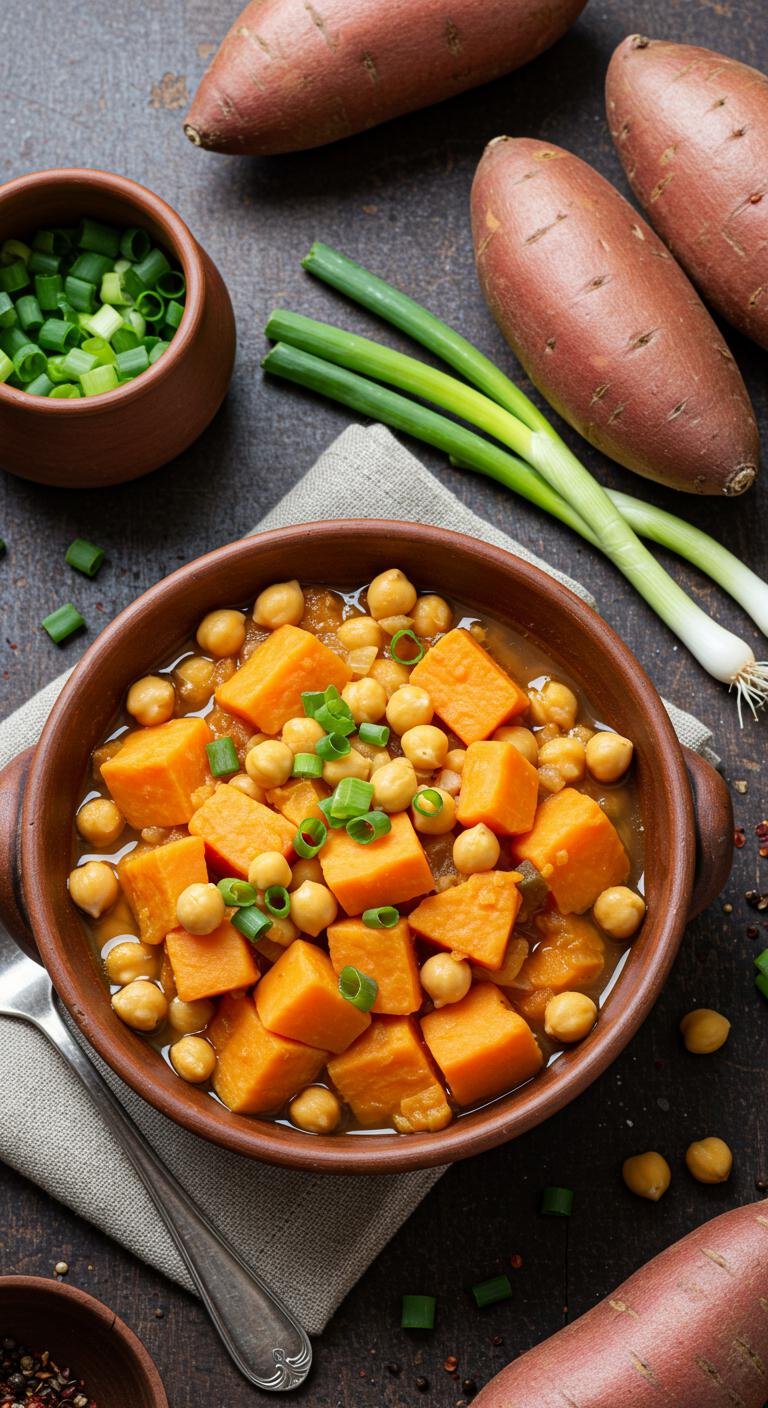- Add sweet potatoes, chickpeas, broth, and cumin; cook until sweet potatoes are tender, about 30 minutes.