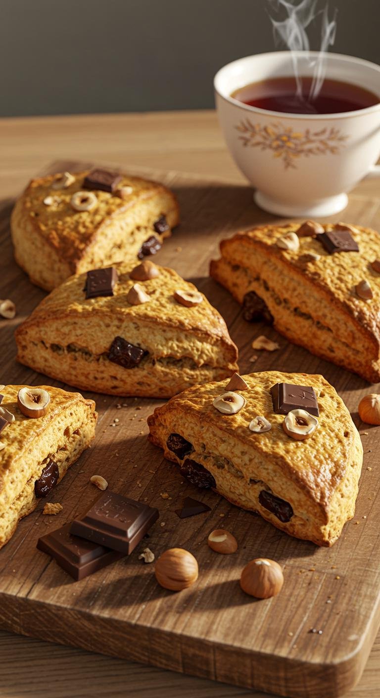 - Combine flour, sugar, and baking powder; cut in butter until crumbly. Stir in chocolate chips and hazelnuts, then add cream to form a dough.
