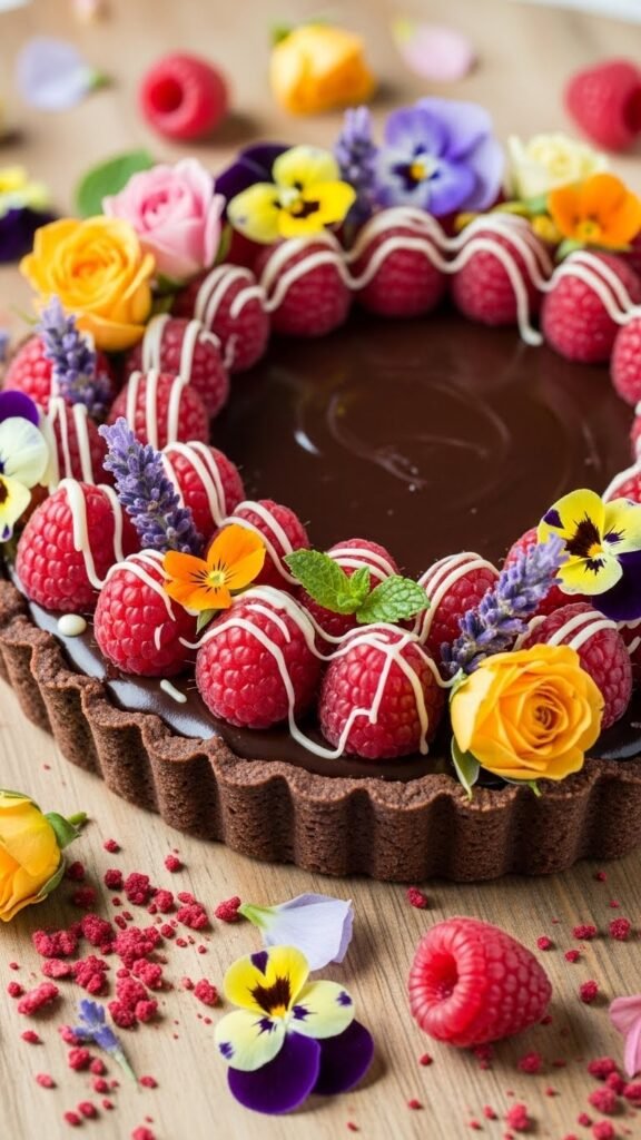 - Pour the mixture into the tart shell and arrange raspberries on top. Chill and decorate with edible flowers before serving.