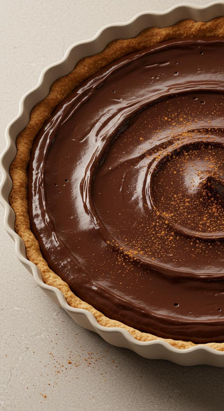 - Pour over chocolate and mix until smooth. Add orange zest, fill the tart shell, and chill.