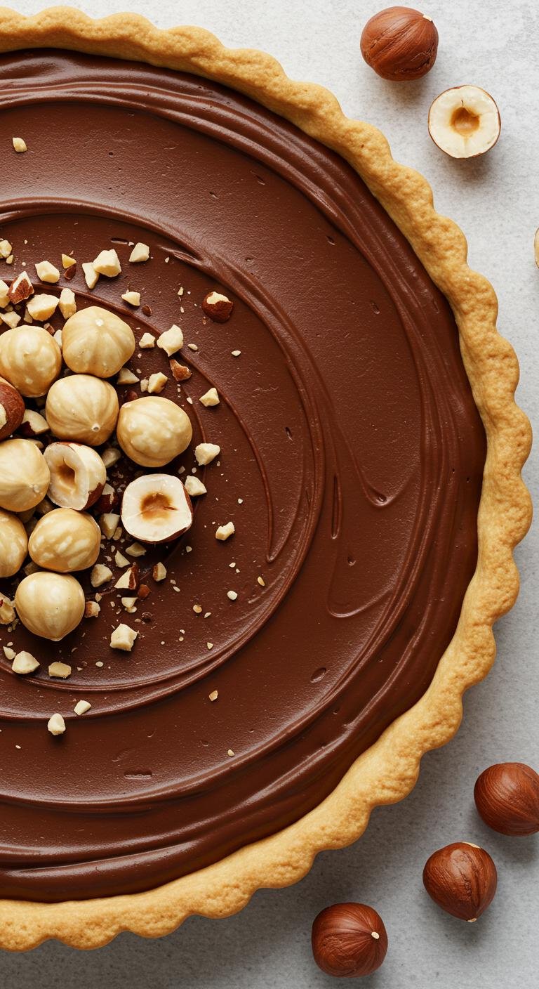 - Bake the shell and let cool. Heat cream and pour over chopped chocolate until melted. Add hazelnut spread and mix until smooth.