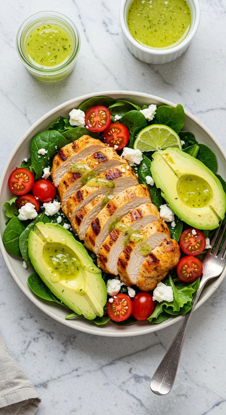 - In a bowl, combine greens, chicken, avocado, tomatoes, and feta.