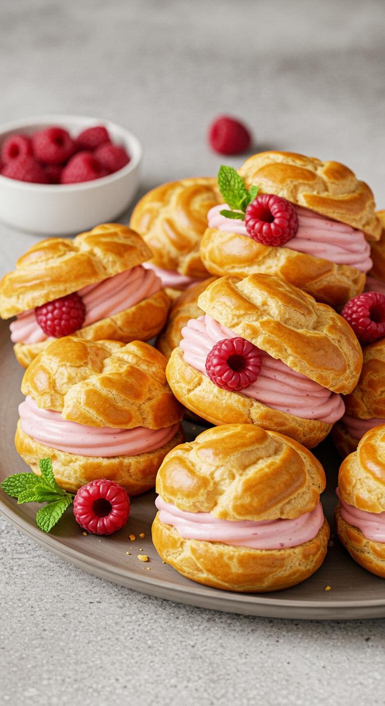 - Pipe the raspberry mixture into puffs and chill briefly.