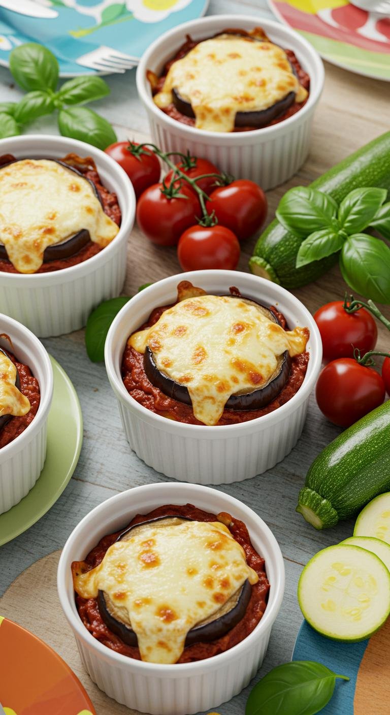- Preheat oven to 375°F (190°C). Layer eggplant slices in individual ramekins with marinara and cheese.