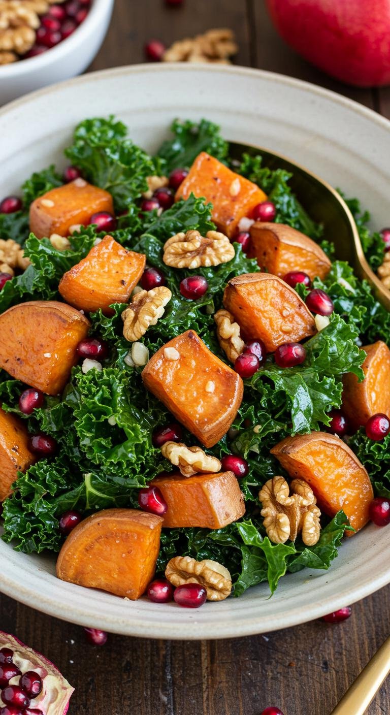 - In a large bowl, mix kale, walnuts, pomegranate seeds, and roasted sweet potatoes.