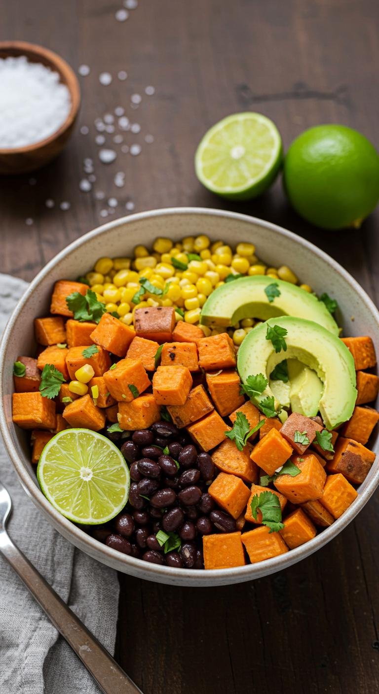 - In a bowl, mix sweet potato, black beans, corn, and avocado.