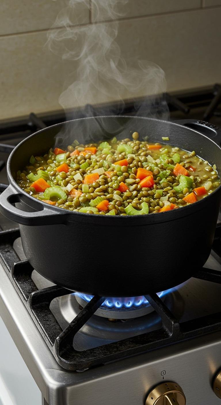 - Stir in lentils, broth, thyme, salt, and pepper. Simmer for 30 minutes.