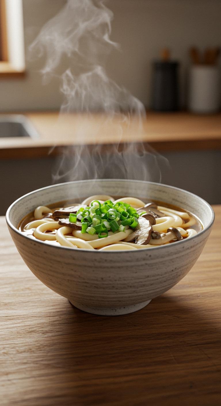 - Add mushrooms, simmer briefly, and serve over udon noodles.