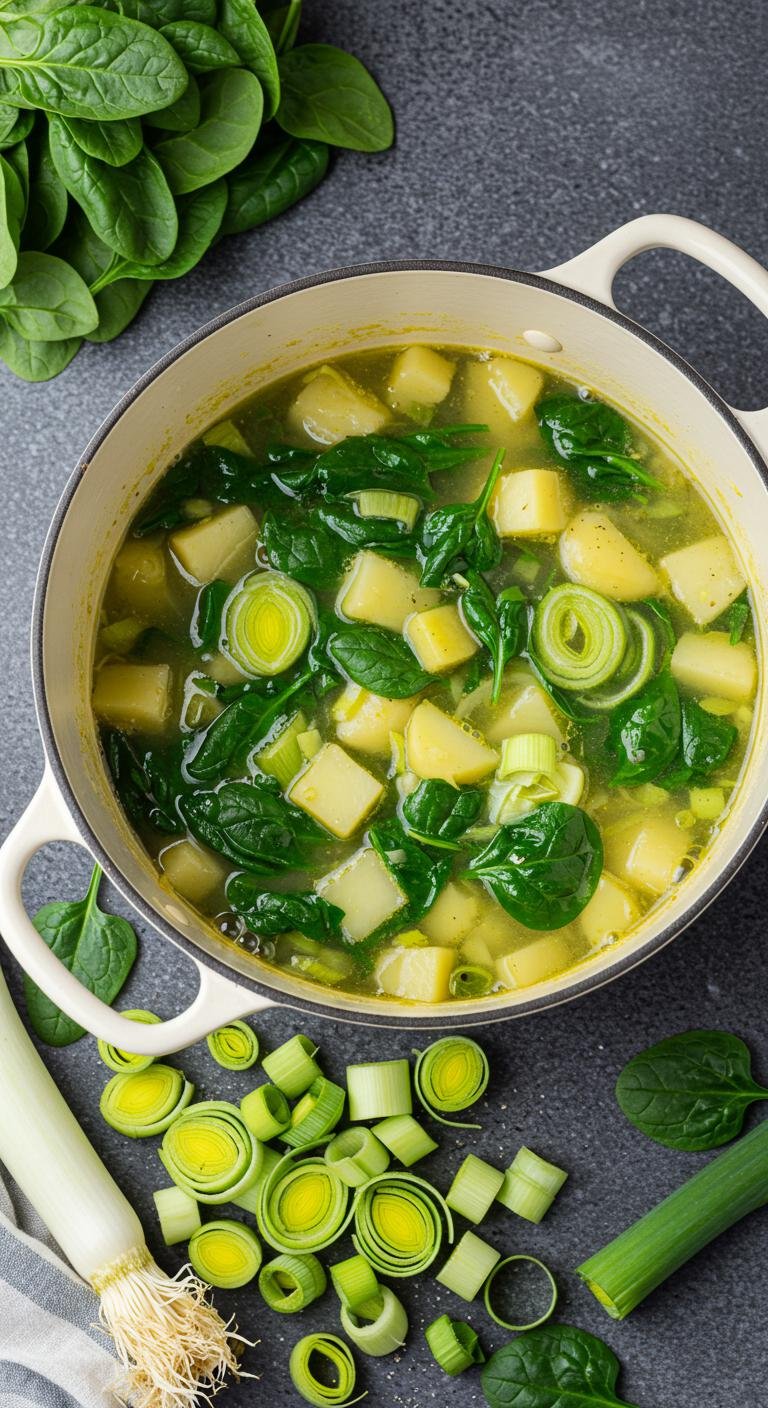 - Sauté leeks until soft; add potatoes and broth, simmer until tender.