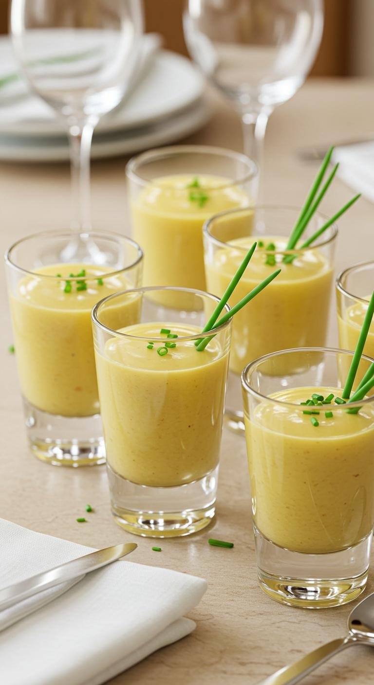 - Serve in shot glasses, drizzled with olive oil and topped with chives.
