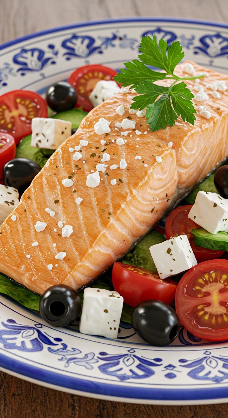 - Combine salmon, tomatoes, olives, and feta in a bowl.