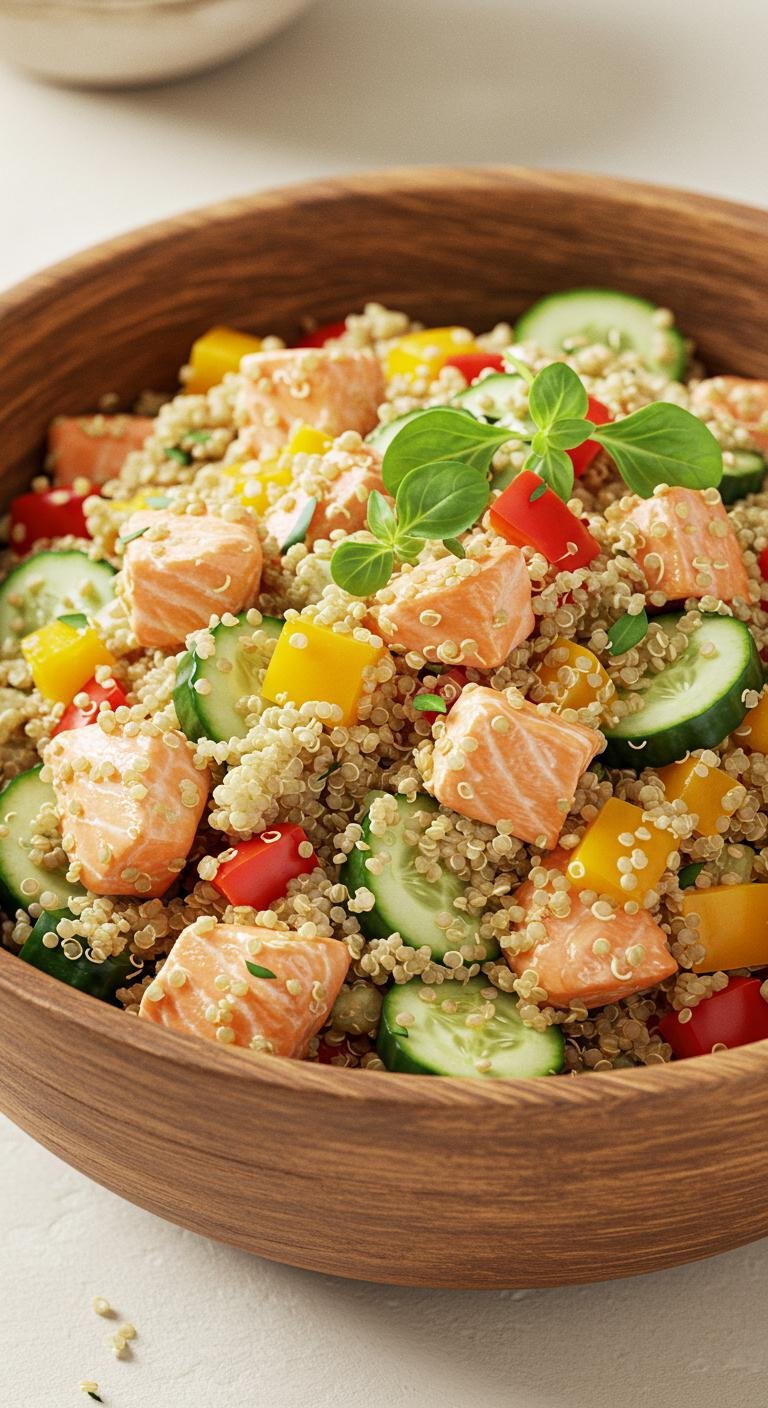 - In a bowl, mix quinoa, salmon, cucumbers, and bell peppers.