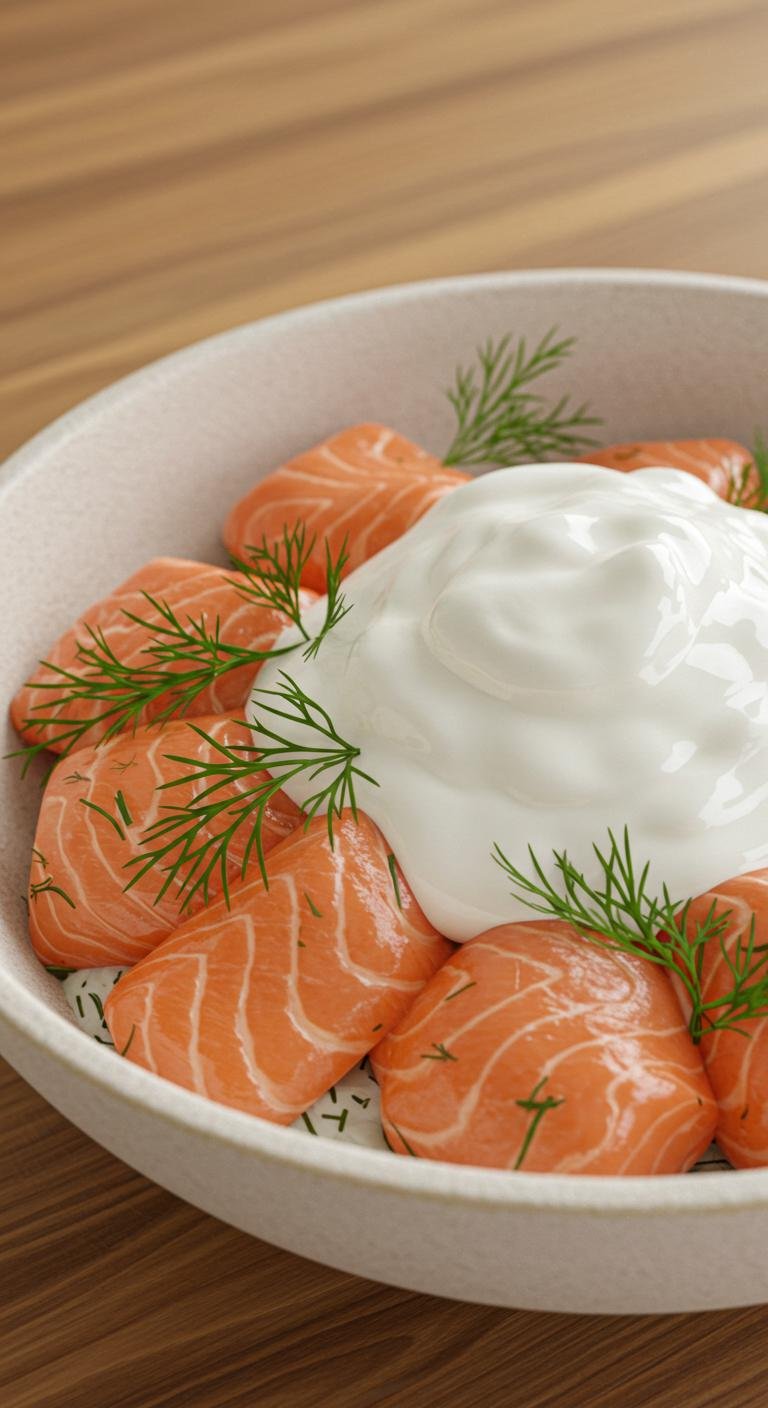 - Mix salmon, yogurt, dill, salt, and pepper in a bowl.