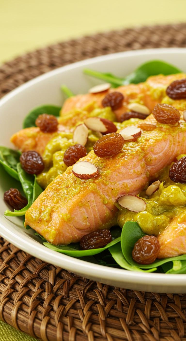 - Combine salmon, curry powder, raisins, almonds, and yogurt in a bowl.