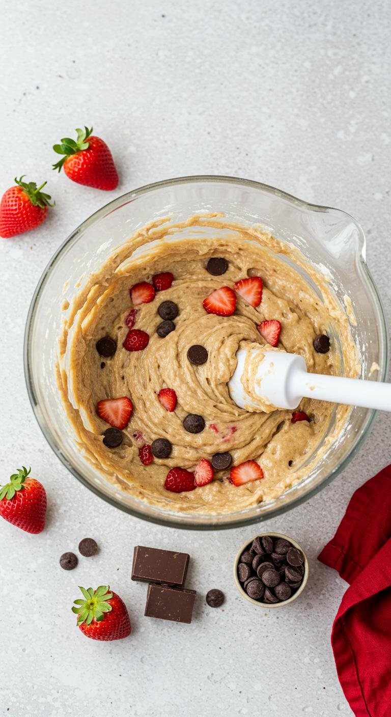 - Fold in chocolate chips and strawberries, scoop onto a baking sheet, and bake at 350°F (175°C) for 12 minutes.