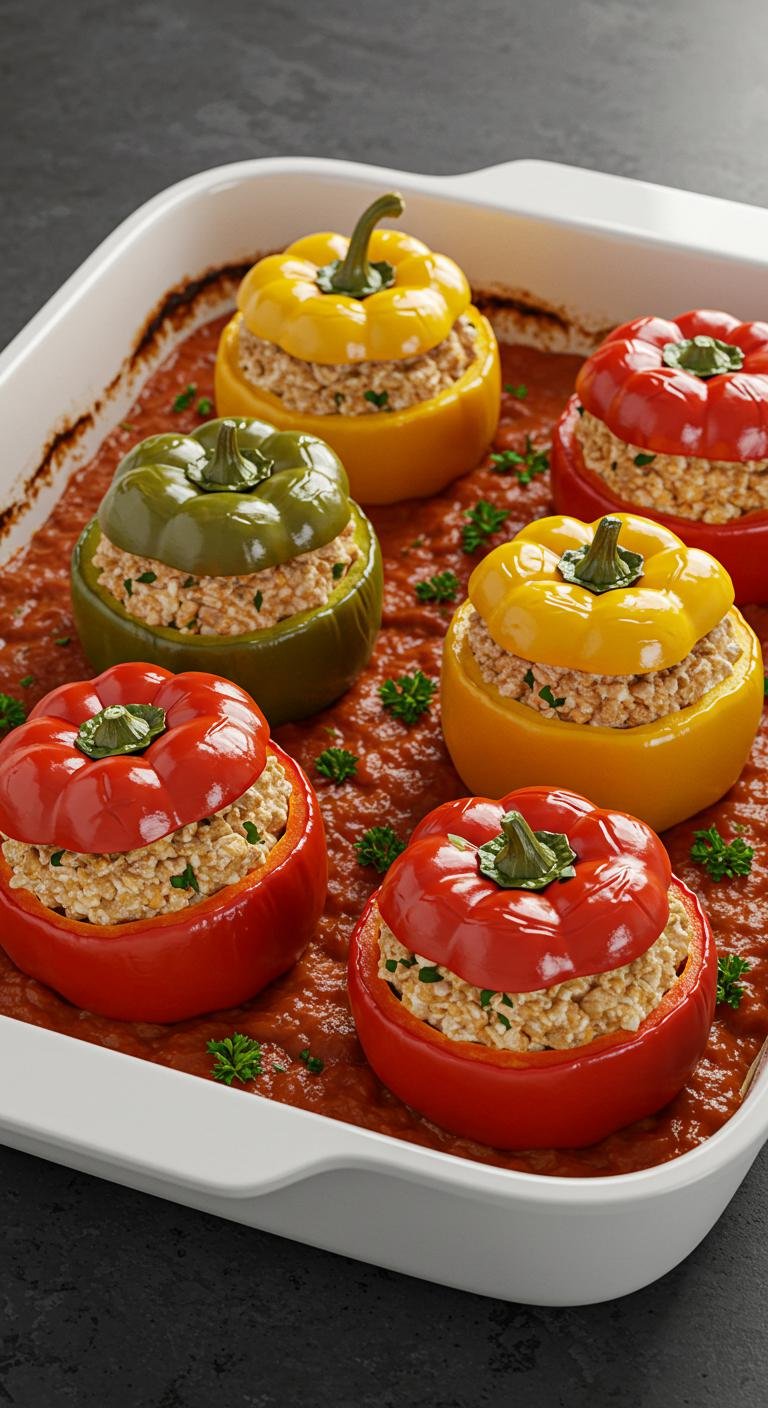 - Prepare for Baking: Place the stuffed peppers standing upright in a baking dish. Pour a small amount of vegetable broth or tomato sauce at the bottom to keep them moist.
