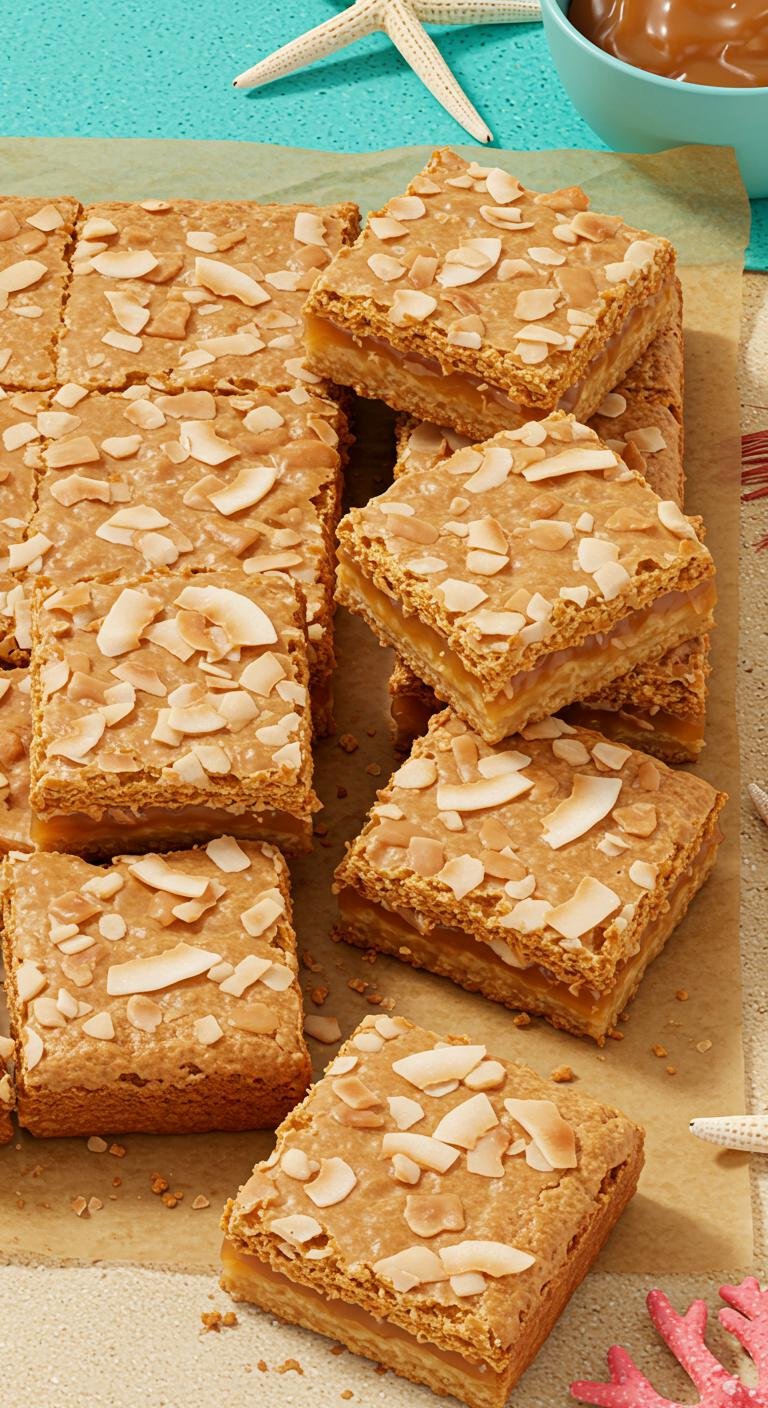 - Cream butter, sugar, and eggs and then mix in the vanilla, flour, and toffee bits along with shredded coconut.