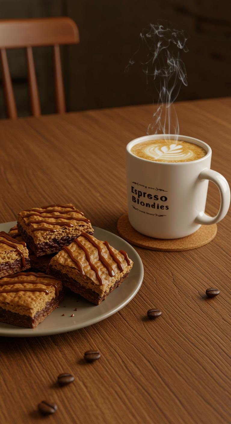 - Cream together butter, brown sugar, eggs, espresso, and vanilla; then blend in flour and toffee bits.